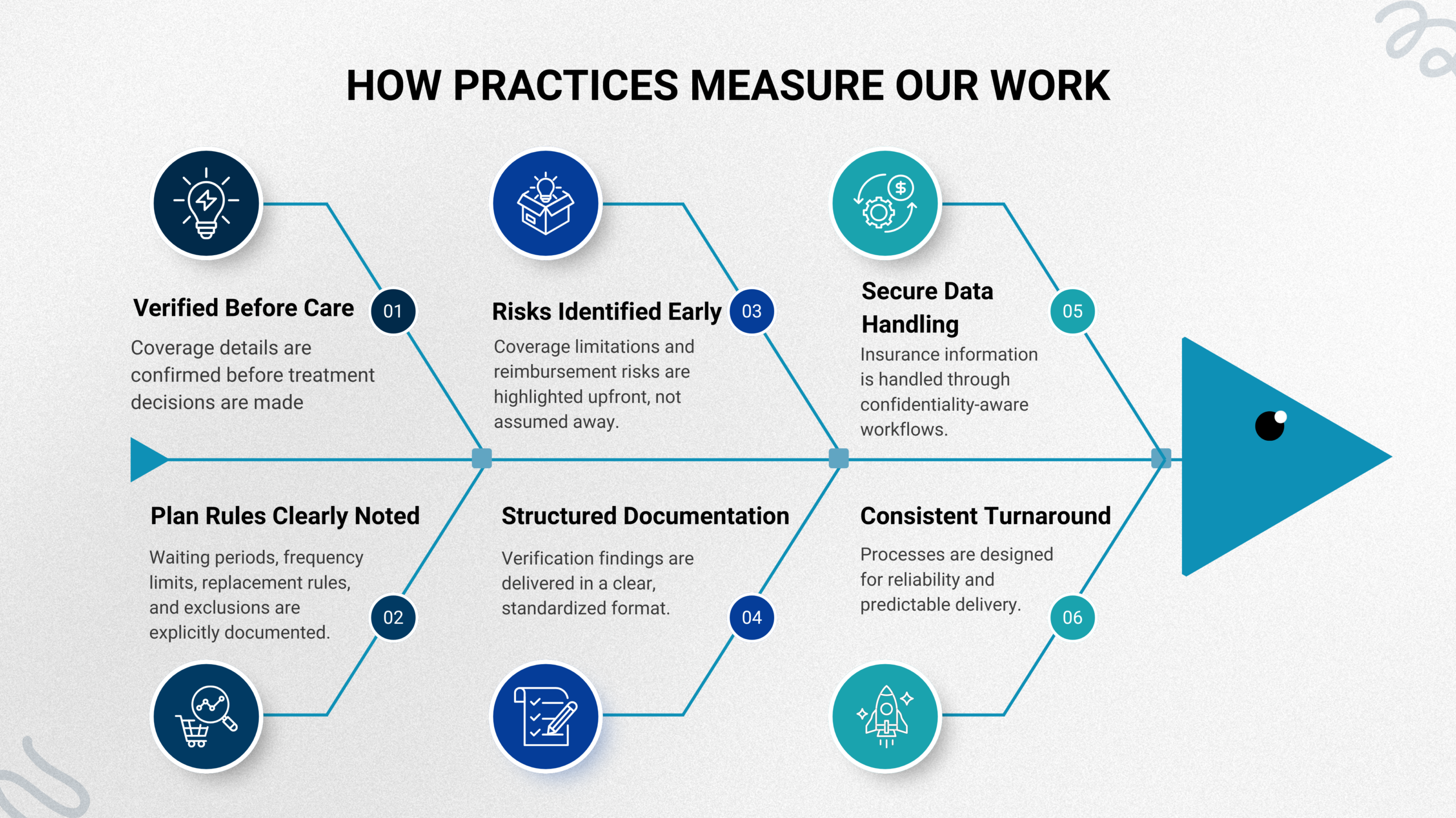 We support dental and medical practices by providing accurate, well-documented insurance verification and operational support before services are delivered. Our work helps practices reduce uncertainty, avoid preventable issues, and make informed clinical and financial decisions with confidence.